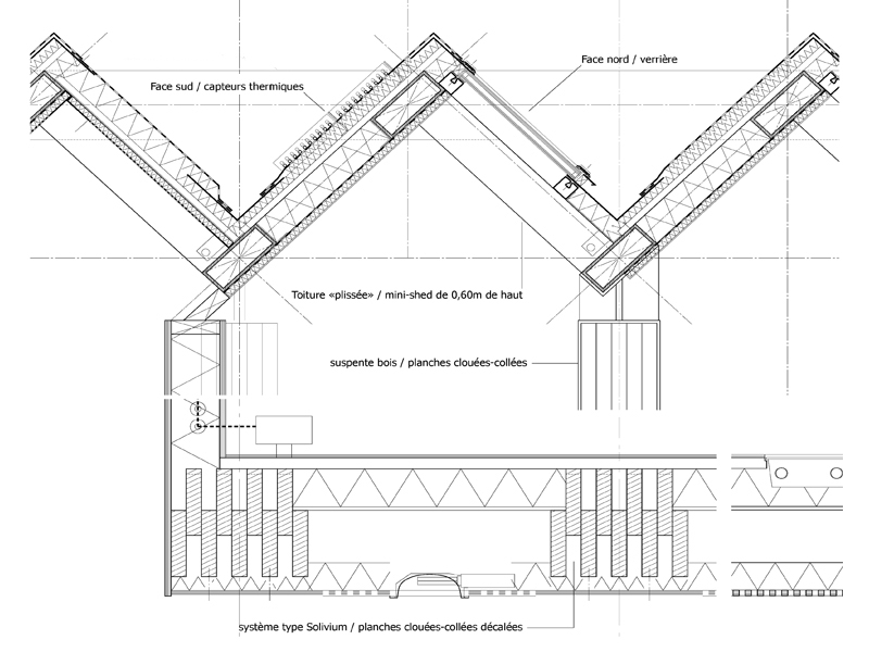 Toiture plissée / planchers suspendus / capteurs solaires / lumière naturelle / Eana
